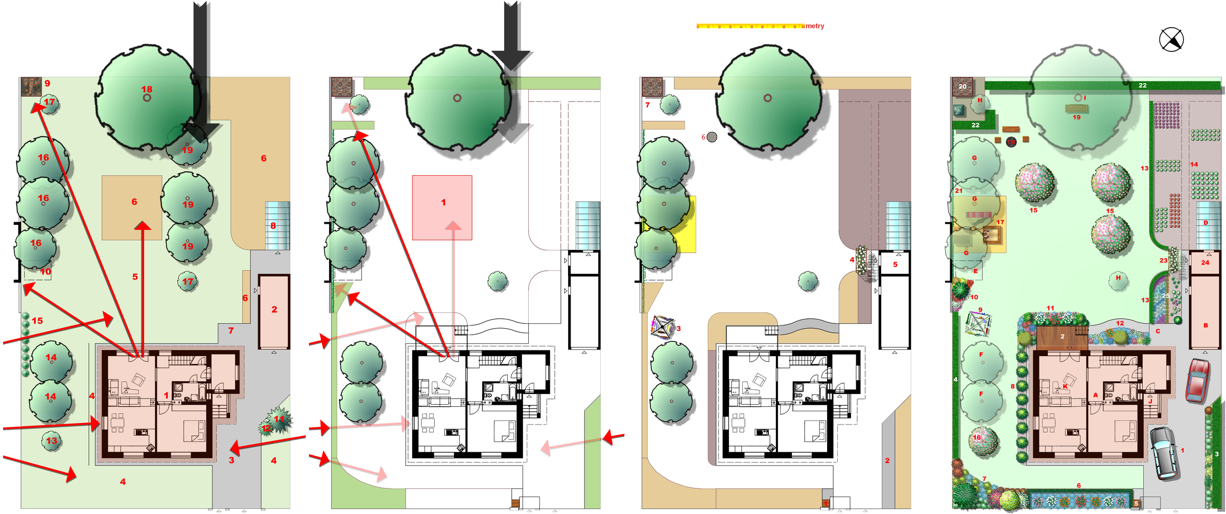 V případě rekonstrukce domu a zahrady na okraji menšího města bylo třeba vyřešit především nedostatečné odclonění od sousedů. Kromě pohledových bariér ze zeleně byly též navrženy nové plochy pro okrasné a ovocné dřeviny a záhony pro zeleninu. Výsledkem jednotlivých analýz je ideový návrh, který slouží jako podklad pro osazovací plán.